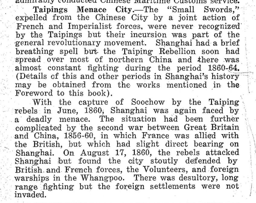 A 1934 guidebook of Shanghai has a surprising level of interest in the Taiping Rebellion from 74 years earlier. The history section concludes with the recent Japanese invasion of Manchuria and "wars come and go…" so they might have felt compelled to include previous battles: